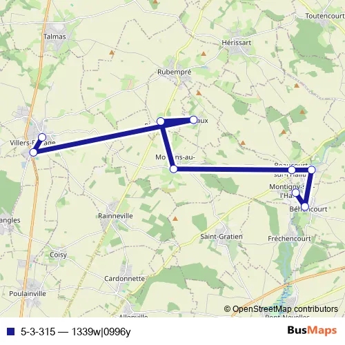 The first stop of the 5-3-315 bus route is Villers-Bocage - Ecole and the last stop is Montigny-SUR-L'Hallue - Rue du Château. 5-3-315 (1339w|0996y) is operational during tous les jours.