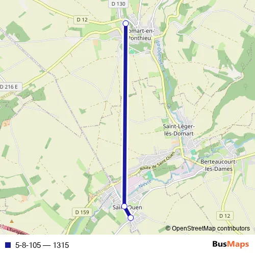 The first stop of the 5-8-105 bus route is Saint-Ouen - Le Christ and the last stop is Domart-EN-Ponthieu - Collège Val de Nièvre. 5-8-105 (1315) is operational during tous les jours.