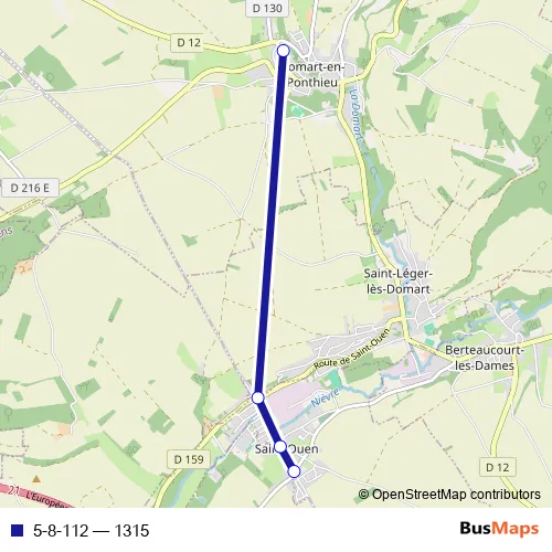 The first stop of the 5-8-112 bus route is Saint-Ouen - Le Christ and the last stop is Domart-EN-Ponthieu - Collège Val de Nièvre. 5-8-112 (1315) is operational during tous les jours.