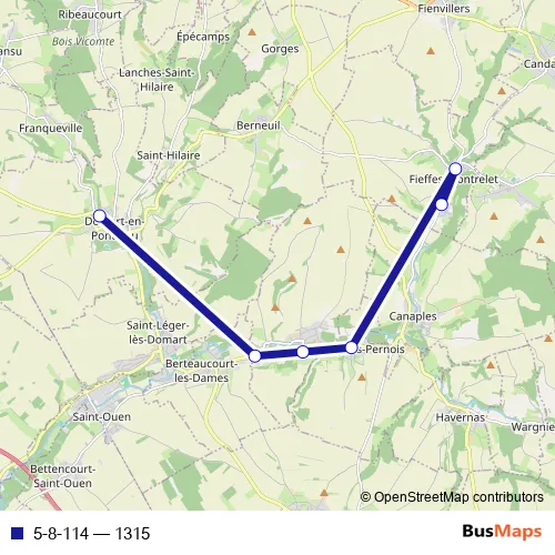 The first stop of the 5-8-114 bus route is Fieffes-Montrelet - Fieffes and the last stop is Domart-EN-Ponthieu - Collège Val de Nièvre. 5-8-114 (1315) is operational during tous les jours.