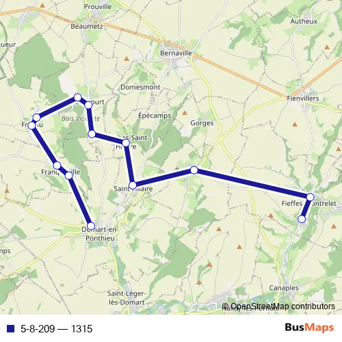 The first stop of the 5-8-209 bus route is Domart-EN-Ponthieu - Collège Val de Nièvre and the last stop is Fieffes-Montrelet - Fieffes. 5-8-209 (1315) is operational during tous les jours.