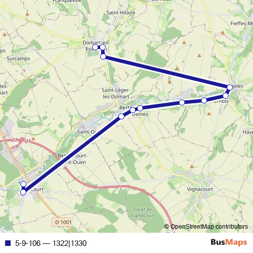The first stop of the 5-9-106 bus route is Domart-EN-Ponthieu - Place des Halles and the last stop is Flixecourt - Collège Ecole Notre Dame. 5-9-106 (1322|1330) is operational during en semaine.