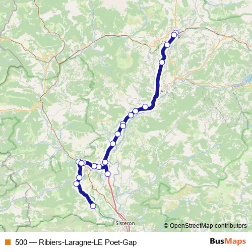 The first stop of the 500 bus route is Collège Mauzan and the last stop is Ribiers Mairie. 500 (Ribiers-Laragne-LE Poet-Gap) is operational during en semaine.