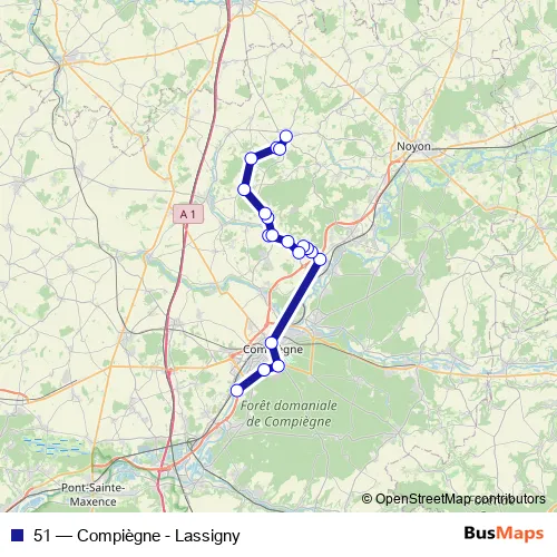 The first stop of the 51 bus route is Gare Sncf and the last stop is Centre. 51 (Compiègne - Lassigny) is operational during tous les jours.