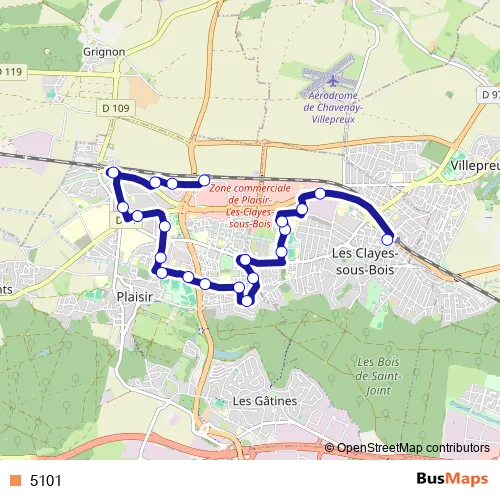 The first stop of the 5101 bus route is Gare de Plaisir - Les Clayes and the last stop is Gare Routière des Clayes. 5101 is operational during tous les jours.