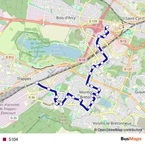 The first stop of the 5104 bus route is Saint-Exupéry and the last stop is Trappes Gare. 5104 is operational during tous les jours.