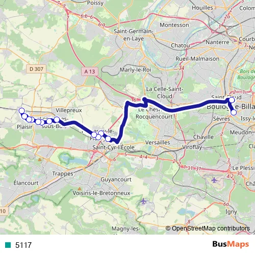 The first stop of the 5117 bus route is Métro Pont de Sèvres and the last stop is Gare de Plaisir Grignon - quai 1. 5117 is operational during en semaine.