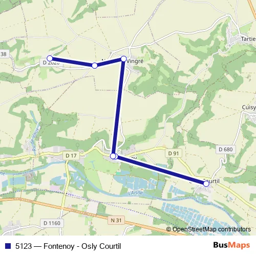 The first stop of the 5123 bus route is Osly Courtil - Place Ecole and the last stop is Nouvron Vingre - Vingre Abri. 5123 (Fontenoy - Osly Courtil) is operational during tous les jours.
