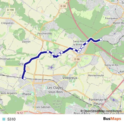 The first stop of the 5310 bus route is Gare de Plaisir Grignon - quai 7 and the last stop is Gare de Saint-Nom-la-Bretèche - Forêt de Marly. 5310 is operational during en semaine.