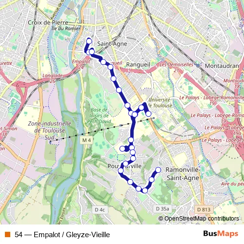 The first stop of the 54 bus route is Empalot and the last stop is Gleyze-Vieille. 54 (Empalot / Gleyze-Vieille) is operational during tous les jours.