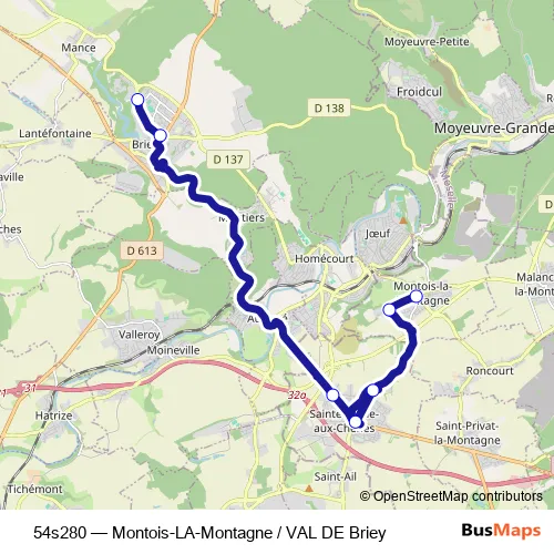 The first stop of the 54s280 bus route is VAL DE Briey - Hôpital Maillot/ L.Bertrand and the last stop is Montois-LA-Montagne - Montois-LA-Montagne Centre. 54s280 (Montois-LA-Montagne / VAL DE Briey) is operational during en semaine.