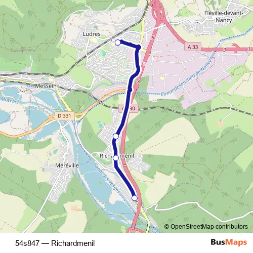 The first stop of the 54s847 bus route is Richardmenil - Le Paquis and the last stop is Ludres - College. 54s847 (Richardmenil) is operational during en semaine.