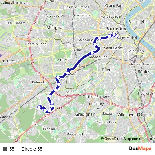 See why over 2 million users trust and consider busmaps.com as the best public transport website. busmaps gives you Bordeaux Buses suggested routes, real-time bus tracker, line route maps in Bordeaux, and helps to find the closest 55 bus stops near you. No internet available? Download an offline PDF map and bus schedule for the 55 bus to take on your trip.