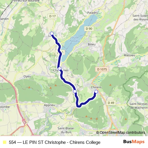 The first stop of the 554 bus route is Chirens, College and the last stop is Villages du Lac de Paladru, PL Saint Christophe. 554 (LE PIN ST Christophe - Chirens College) is operational during en semaine.