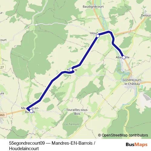 The first stop of the 55egondrecourt09 bus route is Mandres-EN-Barrois - Mandres en Barrois - Ecole and the last stop is Houdelaincourt - Emp. 55egondrecourt09 (Mandres-EN-Barrois / Houdelaincourt) is operational during tous les jours.