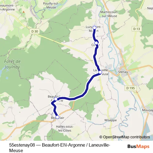 The first stop of the 55estenay08 bus route is Laneuville-SUR-Meuse - Laneuville-SUR-Meuse - Ecole and the last stop is Beauclair - Beauclair. 55estenay08 (Beaufort-EN-Argonne / Laneuville-Meuse) is operational during tous les jours.
