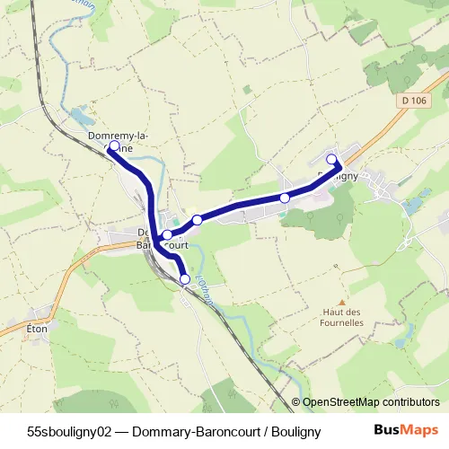 The first stop of the 55sbouligny02 bus route is Bouligny - College and the last stop is Domremy-LA-Canne - Domrémy la Canne - Mairie. 55sbouligny02 (Dommary-Baroncourt / Bouligny) is operational during en semaine.
