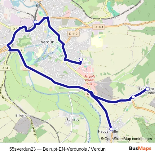 The first stop of the 55sverdun23 bus route is Verdun - College Barres and the last stop is Haudainville - Centre. 55sverdun23 (Belrupt-EN-Verdunois / Verdun) is operational during en semaine.