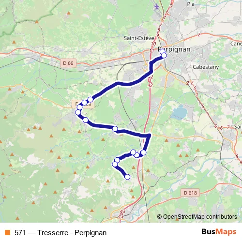 The first stop of the 571 bus route is Perpignan - Gare Routière Bd St Assiscle and the last stop is Tresserre - Lotissement. 571 (Tresserre - Perpignan) is operational during tous les jours.