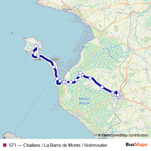 The first stop of the 571 bus route is Gare Sncf and the last stop is Luzeronde. 571 (Challans / La Barre de Monts / Noirmoutier) is operational during tous les jours.