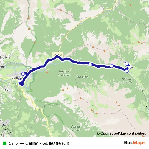 The first stop of the 5712 bus route is Guillestre - Gare Routière and the last stop is L'Ochette. 5712 (Ceillac - Guillestre (Cl)) is operational during en semaine.