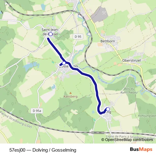 The first stop of the 57esj00 bus route is Gosselming - Ecole and the last stop is Saint-Jean-DE-Bassel - Eglise. 57esj00 (Dolving / Gosselming) is operational during tous les jours.