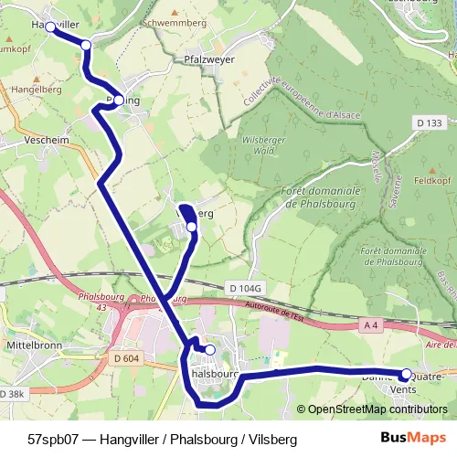 The first stop of the 57spb07 bus route is Phalsbourg - Gare Routiere and the last stop is Hangviller - Ecole. 57spb07 (Hangviller / Phalsbourg / Vilsberg) is operational during en semaine.