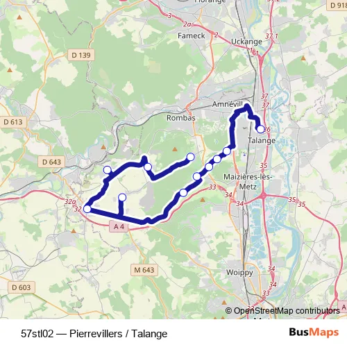 The first stop of the 57stl02 bus route is Pierrevillers - Mairie and the last stop is Talange - Lycee Eiffel. 57stl02 (Pierrevillers / Talange) is operational during en semaine.