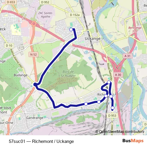 The first stop of the 57suc01 bus route is Uckange - College Moulin and the last stop is Richemont - Champs De Mars. 57suc01 (Richemont / Uckange) is operational during en semaine.
