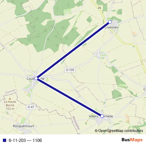 The first stop of the 6-11-203 bus route is Grivesnes - Mairie - Ecole and the last stop is Villers-Tournelle - Mairie. 6-11-203 (1106) is operational during tous les jours.