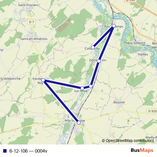 The first stop of the 6-12-106 bus route is Cottenchy - Centre - Salle des Fêtes and the last stop is Ailly-SUR-Noye - Collège William Henri Classen. 6-12-106 (0004v) is operational during tous les jours.