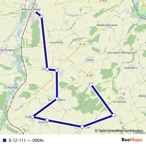 The first stop of the 6-12-111 bus route is Grivesnes - Ainval and the last stop is Ailly-SUR-Noye - Collège William Henri Classen. 6-12-111 (0004v) is operational during tous les jours.