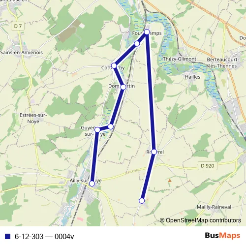 The first stop of the 6-12-303 bus route is Ailly-SUR-Noye - Collège William Henri Classen and the last stop is Ailly-SUR-Noye - Merville au Bois - Eglise. 6-12-303 (0004v) is operational during tous les jours.