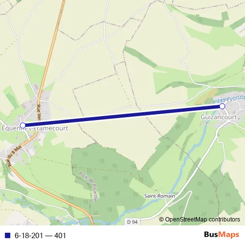 The first stop of the 6-18-201 bus route is Equennes-Eramecourt - Ecole élémentaire and the last stop is Guizancourt - 1 Rue du Marais. 6-18-201 (401) is operational during tous les jours.