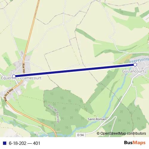 The first stop of the 6-18-202 bus route is Guizancourt - 1 Rue du Marais and the last stop is Equennes-Eramecourt - Ecole élémentaire. 6-18-202 (401) is operational during tous les jours.