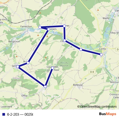 The first stop of the 6-2-203 bus route is Conty - Collège Jules Ferry and the last stop is Courcelles-Sous-Thoix - Mairie - 15 Grande Rue. 6-2-203 (0025t) is operational during tous les jours.