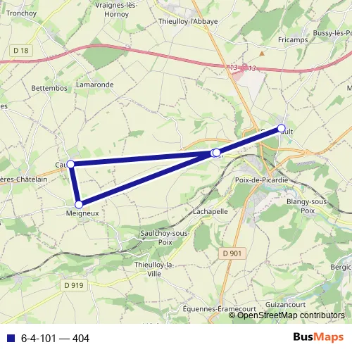 The first stop of the 6-4-101 bus route is Eplessier - Abribus rue principale and the last stop is Croixrault - Ecole primaire. 6-4-101 (404) is operational during tous les jours.
