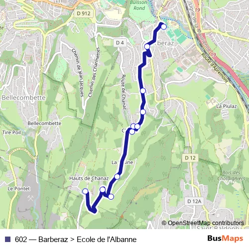 The first stop of the 602 bus route is Le Haut De Chanaz and the last stop is Clos De La Suisse. 602 (Barberaz > Ecole de l'Albanne) is operational during tous les jours.