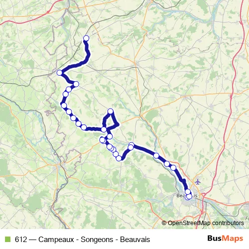 The first stop of the 612 bus route is Beauvais - Gare Routière Quai K - L and the last stop is Songeons - Eglise. 612 (Campeaux - Songeons - Beauvais) is operational during en semaine.