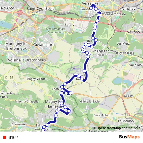 The first stop of the 6162 bus route is Gare de Saint-Rémy-lès-Chevreuse and the last stop is Gare de Versailles Château - Rive Gauche. 6162 is operational during tous les jours.