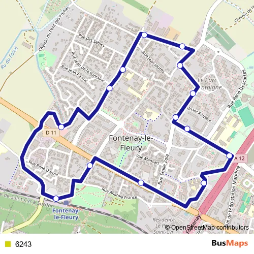 The first stop of the 6243 bus route is Gare de Fontenay-le-Fleury and the last stop is Gare de Fontenay-le-Fleury. 6243 is operational during tous les jours.