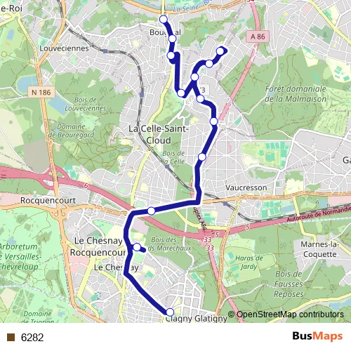 The first stop of the 6282 bus route is Place Laboulaye and the last stop is Pont de Bougival. 6282 is operational during en semaine.