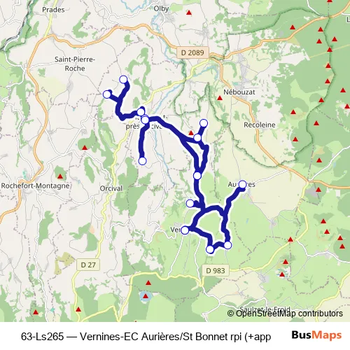 The first stop of the 63-Ls265 bus route is Neuville and the last stop is Ecole Saint-Bonnet-près-Orcival. 63-Ls265 (Vernines-EC Aurières/St Bonnet rpi (+app) is operational during en semaine.