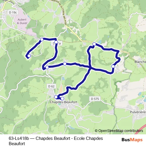 The first stop of the 63-Ls418b bus route is Chimeaux and the last stop is Ecole Publique. 63-Ls418b (Chapdes Beaufort - Ecole Chapdes Beaufort) is operational during tous les jours.