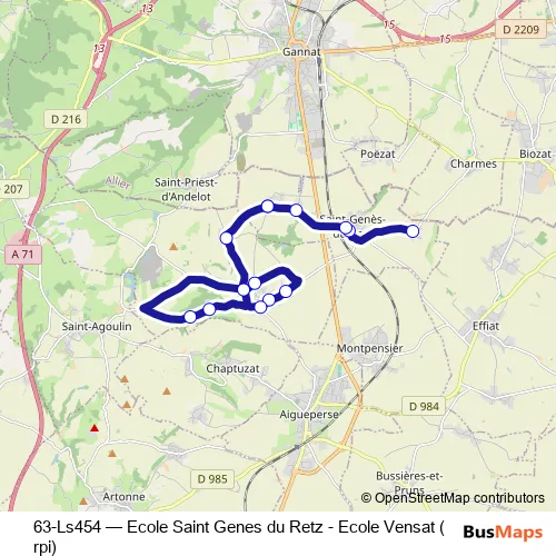 The first stop of the 63-Ls454 bus route is Fusse and the last stop is Ecole Saint-Genès-du-Retz. 63-Ls454 (Ecole Saint Genes du Retz - Ecole Vensat (rpi)) is operational during tous les jours.