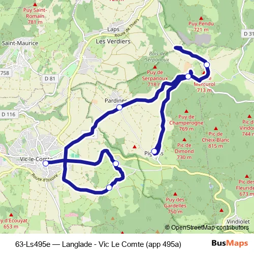 The first stop of the 63-Ls495e bus route is Salle des Fêtes and the last stop is Pardines. 63-Ls495e (Langlade - Vic Le Comte (app 495a)) is operational during en semaine.
