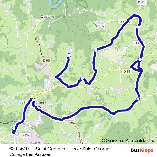 The first stop of the 63-Ls519 bus route is Collège and the last stop is Courteix. 63-Ls519 (Saint Georges - Ecole Saint Georges -Collège Les Ancizes) is operational during en semaine.