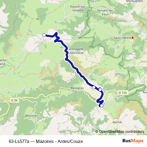 The first stop of the 63-Ls577a bus route is Rue des Ecoles and the last stop is Genelières. 63-Ls577a (Mazoires - Ardes/Couze) is operational during en semaine.