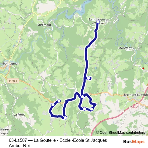 The first stop of the 63-Ls587 bus route is Ecole Saint-Jacques-d'Ambur and the last stop is Le Buchelier Village. 63-Ls587 (La Goutelle - Ecole -Ecole St Jacques Ambur Rpi) is operational during tous les jours.
