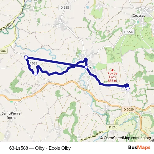 The first stop of the 63-Ls588 bus route is Ecole Olby and the last stop is Le Monteillet. 63-Ls588 (Olby - Ecole Olby) is operational during tous les jours.